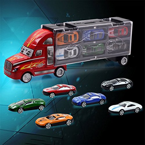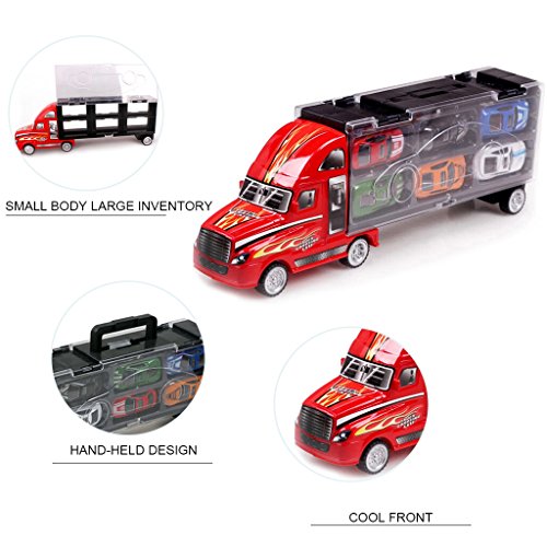 QUALITY MATERIAL : Long truck made of eco-friendly strong plastic, 12 cars all made of Alloy Metal, 1Set includes 1 long truck and 12 pcs cars.Perfect size to keep your cars organized and neat in this great carrier.