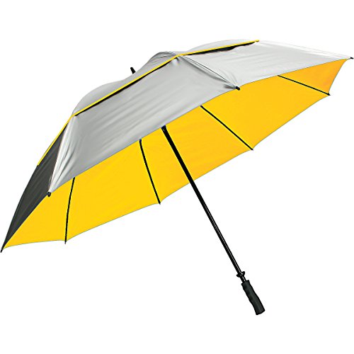 Studio : ProActive Sports, Inc. Publisher : ProActive Sports, Inc. Binding : Sports Product Description This sturdy UV protection vented-canopy umbrella has a 55 UPF (ultra protection factor) and will provide protection from 99 percent of the sun's harmful UV rays (a, b, and C). the silver coating reflects heat leaving you in the cool shade underneath. The double-canopy vortec venting system allows air to flow through between the canopies and will keep the umbrella from inverting in high winds. The fiberglass shaft, ribs, and nylon canopy give you a sturdy yet lightweight construction. This umbrella is great for everyday use around town, on the golf course, or if you're a spectator out in the elements. Includes a nylon sleeve for easy and convenient storage. 0