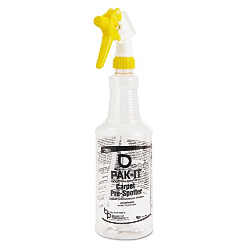 Studio : CLEANER SOLUTIONS Publisher : CLEANER SOLUTIONS Binding : Misc. Product Description Simply drop two pre-measured yellow carpet pre-spotter pak-its into its matching yellow quart trigger spray bottle (sold separately) and add cold, tepid or warm water. Wait two minutes and shake. Adjust nozzle to mist or stream settings and spray liberally onto stain. Allow the product to sit on the stain for one to two minutes to absorb the stain. Rub gently with a hand Brush then blot with paper towel or cloth. Repeat if necessary until stain is removed. Finally rinse with a little clean water and blot dry. If using a carpet steamer or Extractor, spray on stain before use. Note always Test for colorfastness on an inconspicuous surface area. Note: this is the only pak-it quart bottle product that requires 2 pak-its not 1. 0
