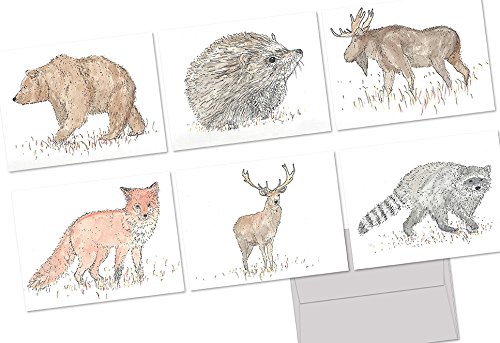 -. Feature : Six different original designs featuring forest animals. / Animlas include: bear, hedgehog, moose, fox, deer, and raccoon / Envelopes are Included / Notecard size: 6.125" x 4.625" - Heavy 15 pt. card stock. / Notecards are blank inside. High quality gloss finish on card exterior.