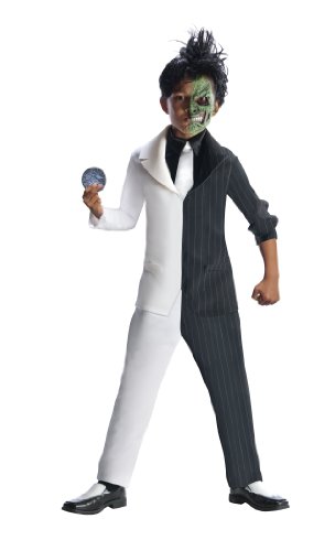 -. Binding : Toy -. Brand : Rubie's -. ClothingSize : One Size -. Color : multi-colored -. Department : unisex-child -. Feature : Half-mask, pants, printed coin and jacket with attached shirt and tie / Two Face and other Batman costumes and accessories from Rubie's are officially licensed by DC Comics / Rubie's brings fun to dress-up with costumes and accessories kids play with all year long / Child large best fits children 10 to 12 years old, up to 60 Inch tall -. Label : Rubies - Domestic -. Manufacturer : Rubies - Domestic -. Model : 881781_L-Parent -. MPN : R881781 -. PackageQuantity : 1 -. PartNumber : R881781 -. ProductGroup : Toy -. ProductTypeName : CHILDRENS_COSTUME -. Publisher : Rubies - Domestic -. Size : One Size -. Studio : Rubies - Domestic -. Title : Rubies DC Super Villains Two Face Costume -. Warranty : No Warranty