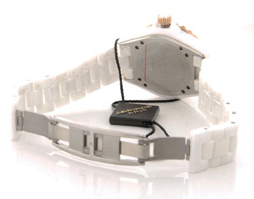 -. Feature : Sport the latest in fashion with this dazzling akribos xxiv ceramic watch / Colored inlaid baguettes adorn the stainless steel bezel / Genuine crystal markers adorn the mother-of-pearl dial / Shatter resistant mineral crystal and screw down crown / Not water resistant