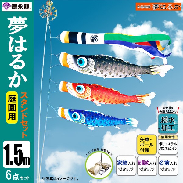 | 夢はるか鯉 庭園用大型鯉のぼり スタンド砂袋式ポール付セット | 1.5m鯉3匹 | 2m鯉3匹 | 3m鯉3匹 3m鯉4匹 3m鯉5匹 | 4m鯉3匹 4m鯉4匹 4m鯉5匹 |