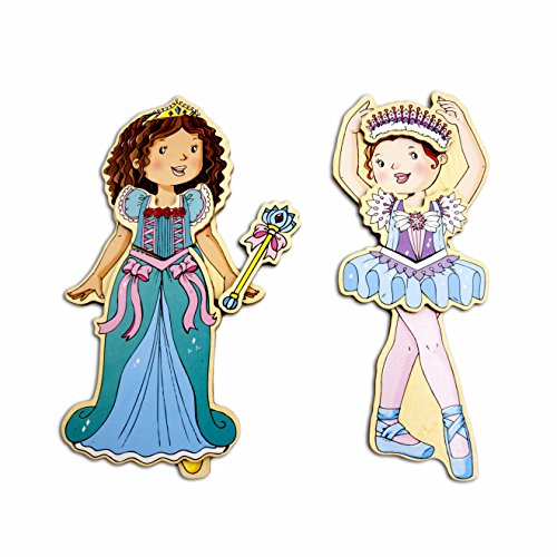 The T.S. Shure Daisy Girls Princess & Ballerina wooden magnetic dress-up dolls provide hours of pretend play fun. Mix and match 37 beautifully illustrated magnetic wooden clothing pieces to create a variety of ballet and princess inspired outfits for Penelope the Princess and Bella the Ballerina dolls. Every wooden magnet doll and clothing piece is beautifully illustrated with detailed watercolor artwork. The Daisy Girls Princess & Ballerina Dress-Up Doll set comes in a fun carrying case with colorful feather trim and a snap pocket for easy travel and storage. Collect all of your favorite Daisy Girls friends! Dress-up set includes two wooden Daisy Girls wooden magnetic dolls and 40 beautifully illustrated wooden magnetic clothing pieces. Mix and match 40 beautifully illustrated magnetic wooden clothing pieces to create a variety of ballet and princess themed outfits. Set comes in a convenient and fun clear carrying case with snap closure pocket and colorful feather trim. This wooden magnetic dress up set encourage storytelling and hands-on interactive play. Perfect for ages 3 and up.Feature