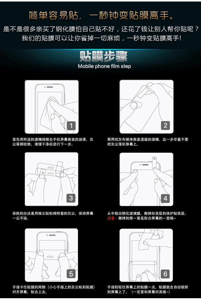 Special Note: iphone6 ​​and 6 plus screen with curved edge design, tempered glass membrane due to the characteristics of the material can not bend is not completely cover the entire screen, from mobile phones will be about 1 mm frame the space, currently on the market and all six steel membrane 6 plus is that, when the film is centered on it