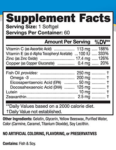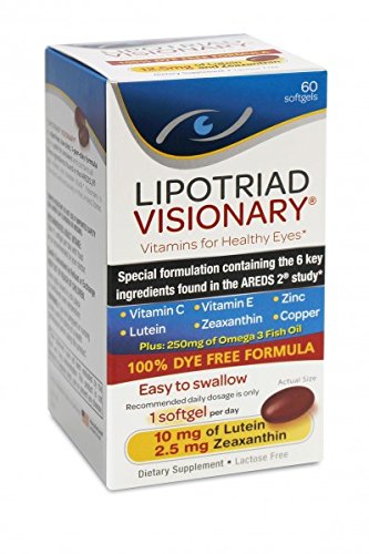 -. Binding : Health and Beauty -. Brand : Lipotriad -. EAN : 0854494003005 -. Feature : Based on the AREDS 2 Study w/10mg of Lutein and 2.5mg of Zeaxanthin per softgel / Only 1 Small Softgel Per Day - 2 month Supply! / Reduced Zinc Dosage of only 17.4mg to help with digestion + 250mg of Fish Oil / Dye Free - No Artificial Coloring and Beta-Carotene Free (Safe For Smokers) / Low Cost - Only $13/mo / 42 Cents per day! - Exp Date: 10/16 -. IsAdultProduct : 0 -. Label : Lipotriad LLC -. Manufacturer : Lipotriad LLC -. MPN : Lipotriad1 -. PackageQuantity : 1 -. PartNumber : Lipotriad1 -. ProductGroup : Health and Beauty -. ProductTypeName : HEALTH_PERSONAL_CARE -. Publisher : Lipotriad LLC -. Studio : Lipotriad LLC -. Title : Lipotriad Visionary AREDS2 Based Eye Vitamin and Mineral Supplement - 2 Mo Supply, 1 Per Day, 60 Softgels -Contains ALL 6 Key Ingredients found in the AREDS 2 Study including 10mg of Lutein, 2.5mg of Zeaxanthin + Fish Oil. - 100% DYE FREE - Safe for Smokers -. UPC : 854494003005