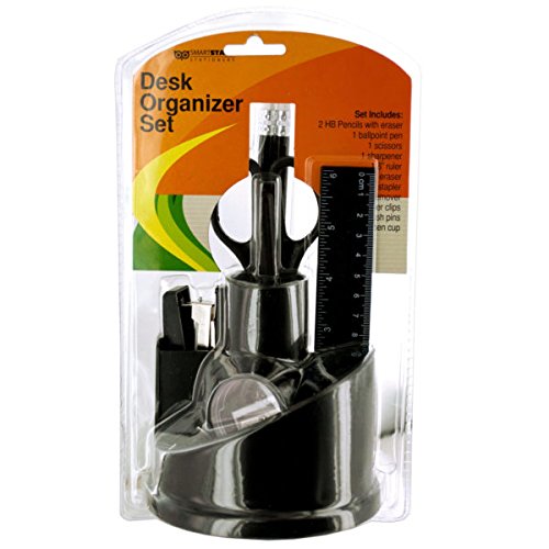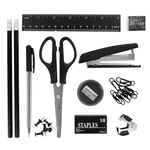 - Set includes: 2 hb pencils with erasers, 1 ballpoint pen, 1 scissors, 1 pencil sharpener, 1 6Ruler, 1 eraser, 1 stapler, 1 staple Remover, 10 paper clips, 5 push pins and 1 pen cup