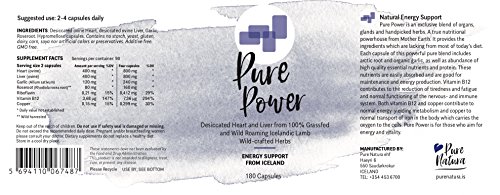 Pure Power food supplement is a dynamic mixture of lambliver and lambheart, combined with selected herbs. These herbs are known for their immune strengthening properties as well as their positive effects on resistance to stress. This blend is suitable for those who want to maximize their performance under physical and mental stress, such as athletes. During stressful periods the dose can be doubled, for example during competition season, through a test session, in connection with exhibitions etc. General support through nutrition and herbs. Pure Power food supplement is an exclusive blend of organs, glands and handpicked herbs. A true nutritional powerhouse from Mother Earth. It provides the ingredients which are lacking from most of today's diet. Each capsule of this powerful pure blend which contains desiccated lamb heart, liver, garlic and arctic root, includes an abundance of essential nutrients of high quality, easily used by your body for maintenance and energy production. Pure Power is for those who aim for energy and vitality. From grass-fed lamb , free-range No additives or artificial ingredients of any kind Abundant in protein and key amino acids Rich in vitamin B12 High in collagen Contains naturally occurring coenzyme Q10