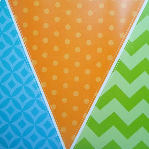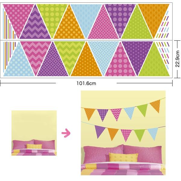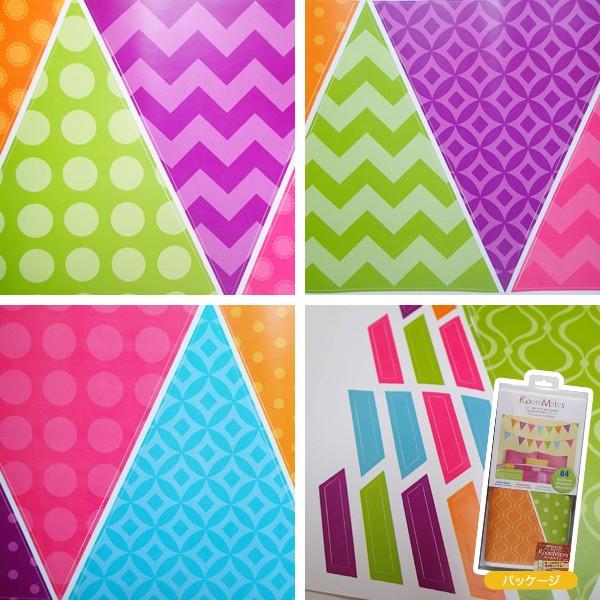 カラフルな配色で、お部屋の印象がガラっと変えられるバナータイプのステッカーです。 こども部屋やリビングの装飾はもちろん、お誕生日会やパーティ、シーズンイベント、店舗などにもオススメです。旗はお好きな並びに配置できます。 ★商品名★パターンペナント★商品番号★RMK2437SCS ★シートサイズ★[101.6cm × 22.9cm]×2枚★内容★64ピース/1パック