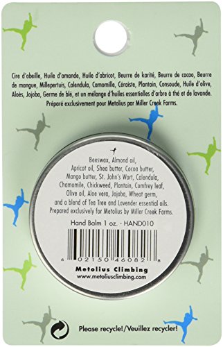 FEATURES of the Metolius Hand Repair Balm Specifically formulated for climbers' dry, chapped hands and fingers Antiseptic blend speeds healing and promotes new skin growth Can be applied directly to cuts, scrapes, sun burns, bug bites and chapped lips Available individually or 12 packs in 1/2 oz / 14 g or 1 oz / 28 g screw-top tins Made in Oregon of natural, organic ingredientsFeature