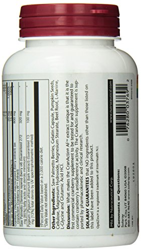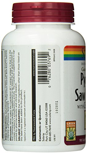 -. Binding : Health and Beauty -. Brand : Solaray -. EAN : 0076280037692 -. Feature : Contains these two herbs, each with a guaranteed potency, as well as cranberry extract to prevent bladder or urinary tract issues / Zinc, pumpkin seeds and vitamin B6 have also been shown to play an important role in prostate support / Most complete supplement for men's prostate and urinary health -. IsAdultProduct : 0 -. Label : Solaray -. Manufacturer : Solaray -. MPN : 0076280037692 -. NumberOfItems : 1 -. PackageQuantity : 1 -. PartNumber : 0076280037692 -. ProductGroup : Health and Beauty -. ProductTypeName : HEALTH_PERSONAL_CARE -. PublicationDate : 2014-10-17 -. Publisher : Solaray -. ReleaseDate : 2015-07-16 -. Size : 90 -. Studio : Solaray -. Title : Solaray Pygeum and Saw Palmetto with Cranactin Supplement, 90 Count -. UPC : 076280037692