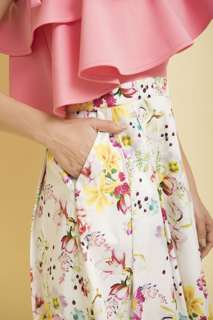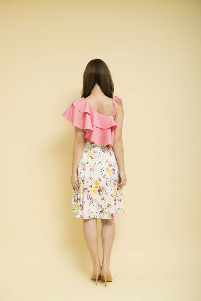 ビックフリルが小顔効果を、ウエストの位置を高く設定しているので足長効果でスタイルアップ出来る1枚です。