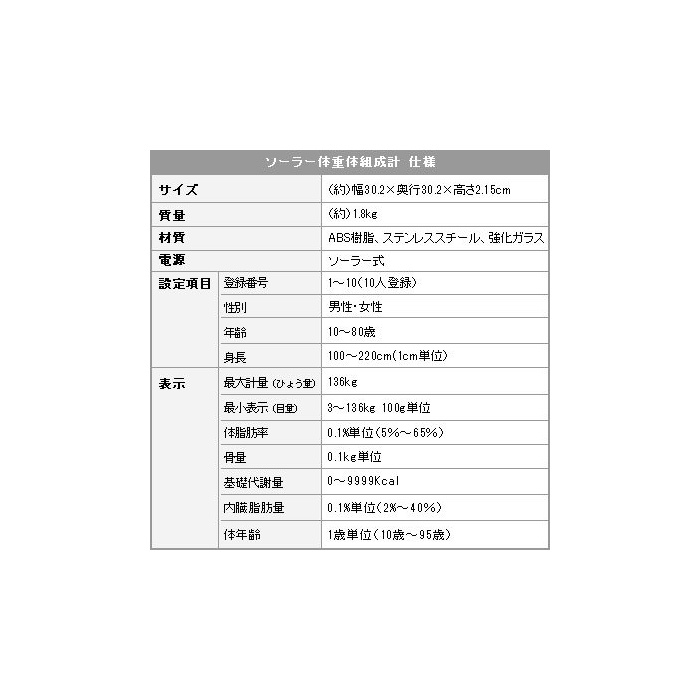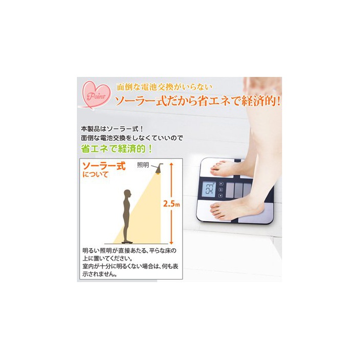 체중,체지방율,골분량,기초 대사량,내장 지방율,체연령의 6항목을 계측 할 수 있는 전지 불요의 솔라 체중태 조성계입니다.