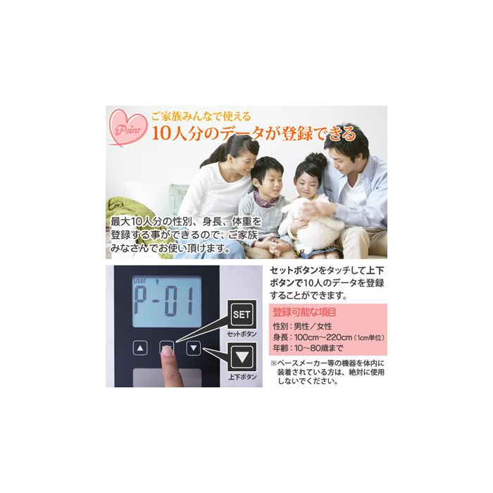10명분의 개별 데이터가 등록 가능하고,측정 결과가 보기 편리한 커다란 문자 표시이기 때문에,가족 여러분에 사용하실 수 있습니다.