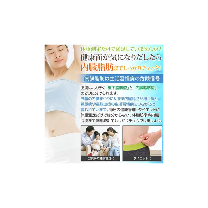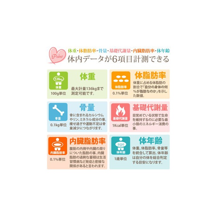 체중뿐만 아니라 6항목 계측 할 수 있는 때문에,매일의 건강관리나 다이어트에 적합.몸이 느낌이 나는 곳을 이것 1대로 압니다.