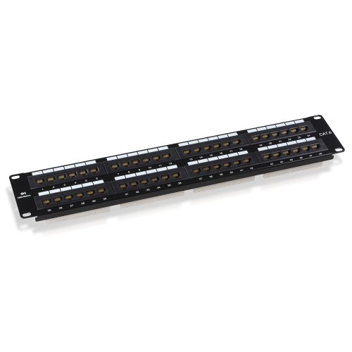 Heavy duty 48 port patch panel supports Cat6 Ethernet and is backwards compatible with Cat5e Ethernet
