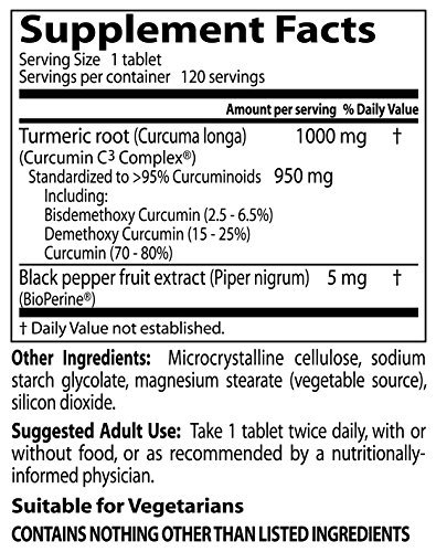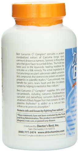 Studio : Doctor's Best Publisher : Doctor's Best Binding : Misc. Product Description Doctor's Best Curcumin with Curcumin C3 Complex and BioPerine contains a potent standardized extract of Curcuma longa root, known as turmeric. Turmeric has centuries of tradition in Ayurvedic healing. The active ingredients in Curcuma Longa are curcuminoids, compounds that demonstrate potent antioxidant properties in scientific studies. Curcuminoids may benefit the joints, brain, heart, and circulatory system by helping to neutralize free radicals. BioPerine is an extract of Black Pepperfruit that contains 95-98% piperine as a natural bio-enhancer to promote absorption. 0