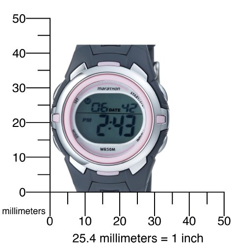 Brand, Seller, or Collection Name:Timex Model number:T5K360 Part Number:T5K360 Model Year:2011 Item Shape:Round Dial window material type:Acrylic Display Type:Digital Clasp:Buckle Case material:Resin Case diameter:34 millimeters Case Thickness:12.52 millimeters Band Material:Resin Band length:Women's Standard Band width:12 millimeters Band Color:Grey Dial color:Grey Bezel material:Resin Bezel function:Stationary Calendar:Day and date Special features:Chronograph Item weight:1.12 Ounces Movement:Quartz Water resistant depth:165 Feet