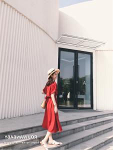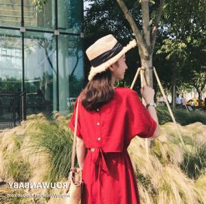半袖ワンピース カジュアルワンピース バックデザイン バックリボン ハイウエスト ミディアム丈 プチプラ 無地 大人カジュアル