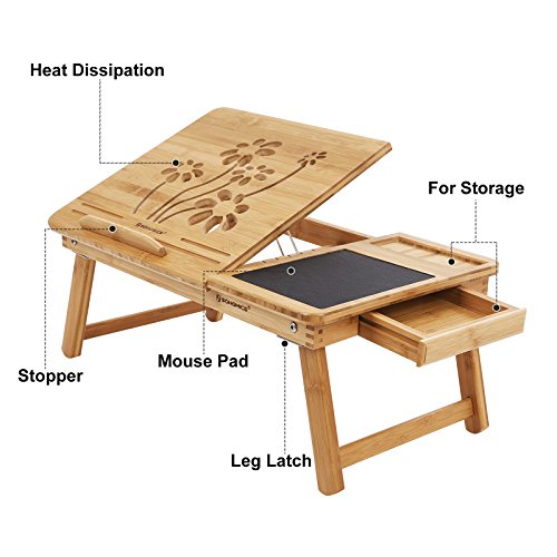 -. Feature : ADJUSTABLE TILTING ANGLE: 5 slots to accommodate your own ideal angle, providing better viewing experience / CONVENIENT STORAGE: 1 built-in mousepad, 1 rectangular groove and 1 small pull-out drawer keep your pens, sticky notes, USB disk and earphones nearby / GREAT HEAT DISSIPATION: Hollowed out flowers for better heat dissipation while adding esthetic to the computer desk / LOCKABLE LEGS: 2 Metal latches help ensures stability and keep legs from swaying when moving or storing / WELL-MADE DESK: 100% Natural Bamboo, eco-friendly, durable and renewable; side push plates effectively keep the table top from warping and enchance the durability