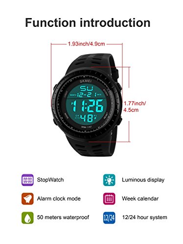 -. Feature : Taiwan IC chip set, Japanese battery. / 164FT/50M water resistant,shower,washing,no problem. / Sports stylish design,resin bezel and case,wearproof and lightweight. big digital back light display. / Smooth feel and ventilate band,durable,flexible and comfortable. / Stainless steel clasp and back plate will bring you excellent wearing experience.