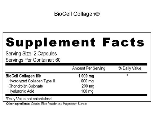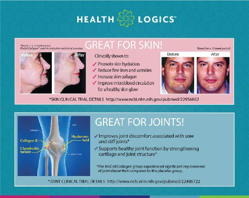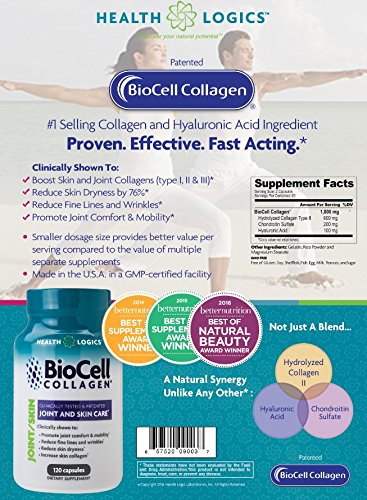 -. Binding : Health and Beauty -. Brand : Health Logics -. Feature : 2 bottles of 120 Capsules / BioCell Collagen is the award winning and patented skin & joint supplement proven to work in multiple human clinical trials. BioCell Collagen contains a natural synergy of hydrolyzed collagen type II, chondroitin sulfate, and hyaluronic acid in matrix form that cannot be found in any other supplement / Clinically shown to reduce joint stiffness and discomfort. Promotes joint lubrication and mobility. Promotes cartilage, tendon, ligament, and connective tissue health / Clinically shown to reduce fine lines and wrinkles, and reduce skin dryness by 76%. Clinically shown to increase skin collagen (type I & III) and blood microcirculation in the face / Made in the USA in a GMP-certified facility. Winner of Better Nutrition's 2014 Best of Supplements Award. Winner of Frost & Sullivan's Best Joint Health Ingredient Award, Since 1997, millions of people around the world have experienced the benefits of BioCell Collagen. Backed by clinical trials, BioCell Collagen has been shown to help the body maintain healthy connective tissues, flexible joints, and younger looking skin. It contains a patented composition of hydrolyzed collagen type II, chondroitin sulfate, and hyaluronic acid in a naturally-occurring matrix form that cannot be found in any other supplement. Multiple human clinical studies have validated BioCell Collagen's safety, efficacy, and rapid absorption into the body. In addition, a recent study presented at the 2014 International Society of Sports Nutrition Conference demonstrated that BioCell Collagen aids in the protection and recovery of musculoskeletal tissue during sports activity, making it a highly effective performance recovery supplement -. Label : Health Logics -. Manufacturer : Health Logics -. ProductGroup : Health and Beauty -. ProductTypeName : HEALTH_PERSONAL_CARE -. Publisher : Health Logics -. Studio : Health Logics -. Title : Health Logics BioCell Collagen Joint and Skin Care 120 Capsules