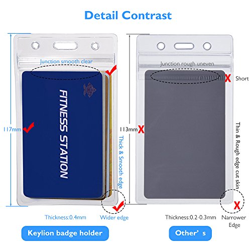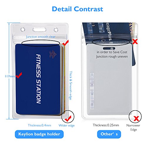 Durable PVC (poly vinyl chloride) material, wear-resistant and corrosion-resistant properties. Single layer thickness is increased to 0.4mm, with an increase of 60% compared to the standard thickness 0.25mm in Amazon. High transparency. Even if multiple badge holders overlapping, read effortlessly.
