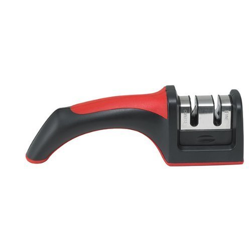 Keep knives precision sharp with the crossed steel blades and ceramic honing rods in this safe and easy to use 2-stage sharpener. Soft grip ergonomic handle. Coarse carbide steel blades for sharpening. Handle with non-skid base. Ceramic rods for honing.