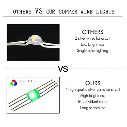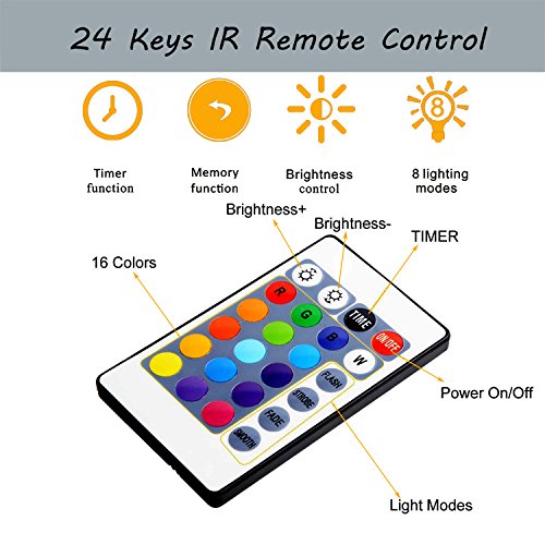 Very Handy Remote:The string lights with a timer remote in hand you can easily to turn or off it, choose what mode you like. Surprised 24 buttons; up to 16 colors options; Fade Mode (auto-switch among 16 colors slowly); Jump Mode (auto-switch among 16 colors rapidly); Timer Mode (8 hours on and 16 hours off).