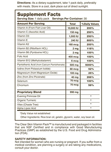 -. Binding : Health and Beauty -. Brand : Innate Skin -. EAN : 0850006005000 -. Feature : The premium vitamin supplement for acne! Contains the best form of zinc, zinc picolinate. / Provides your body with the nutrients it needs to clear up and keep acne away. / Compare our ingredients and quality and you will understand why this is the best clear skin supplement on the market. / Contains proven acne fighting vitamins and minerals in this acne supplement. / Made in the USA: Manufactured and packaged in facilities that are NSF Certified and in compliance with Good Manufacturing Practices (GMP) as established by the U.S. Food and Drug Administration (FDA). -. IsAdultProduct : 0 -. Label : Innate Skin -. LegalDisclaimer : These statements have not been evaluated by the Food and Drug Administration.These products are not intended to diagnose, treat, cure or prevent any disease. -. Manufacturer : Innate Skin -. ProductGroup : Health and Beauty -. ProductTypeName : HEALTH_PERSONAL_CARE -. Publisher : Innate Skin -. Studio : Innate Skin -. Title : Clear Skin Vitamin Pack for Acne - 30 Day Supply of Acne Supplement -. UPC : 850006005000
