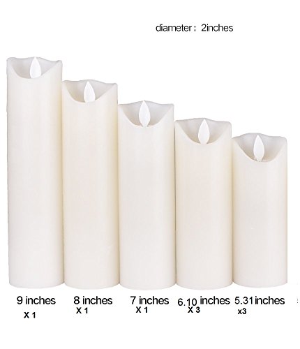 - 9 piece LED Candle, 2" diametedimming, flickering, brightness, timers 2/4/6/8 hour per day -remote battery is includedrs each. 3 - 5" tall 3 - 6" tall 1 - 7" tall 1 - 8" tall 1 - 9"