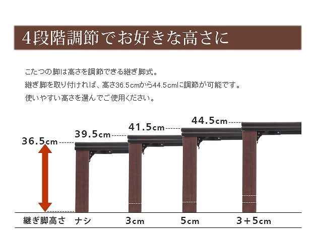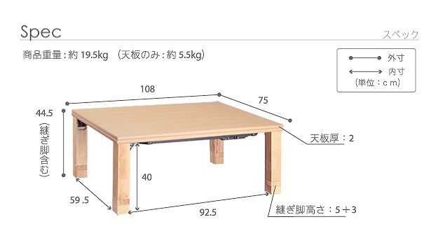 サイズ(cm):幅108x奥行75x高さ44.5cm(36.5+継ぎ脚5cm+継ぎ脚3cm)・約19.5kg