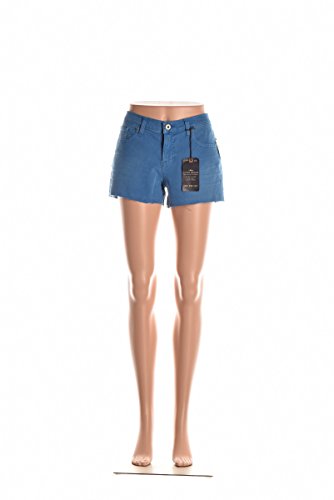 Blue cut-off short with frayed edges featuring five-pocket styling