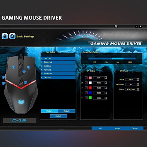 Programable Driver: Install the software driver from the included CD to customize your gaming mouse for each operation and function according to your specific requirements. You can change the button settings, lighting modes, lighting colors and DPI settings via this progamable driver. If there is not a CD driver with your computer, please contact amirus@foxmail.com for help.