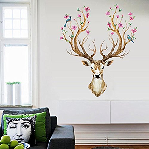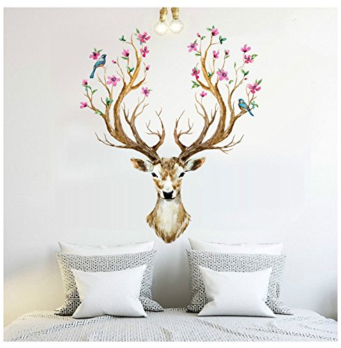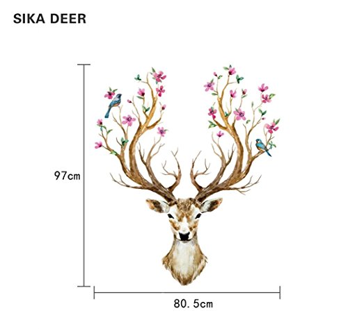 BIBITIME Merry Christmas Booming Flower Antlers Sika Deer Wall Decal Sticker for Nursery Moose Wall Decor Home Art Murals DIY Vinyl Removable Decals for Kids Boys Girls Room