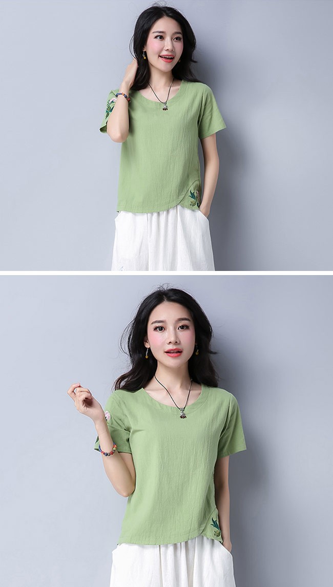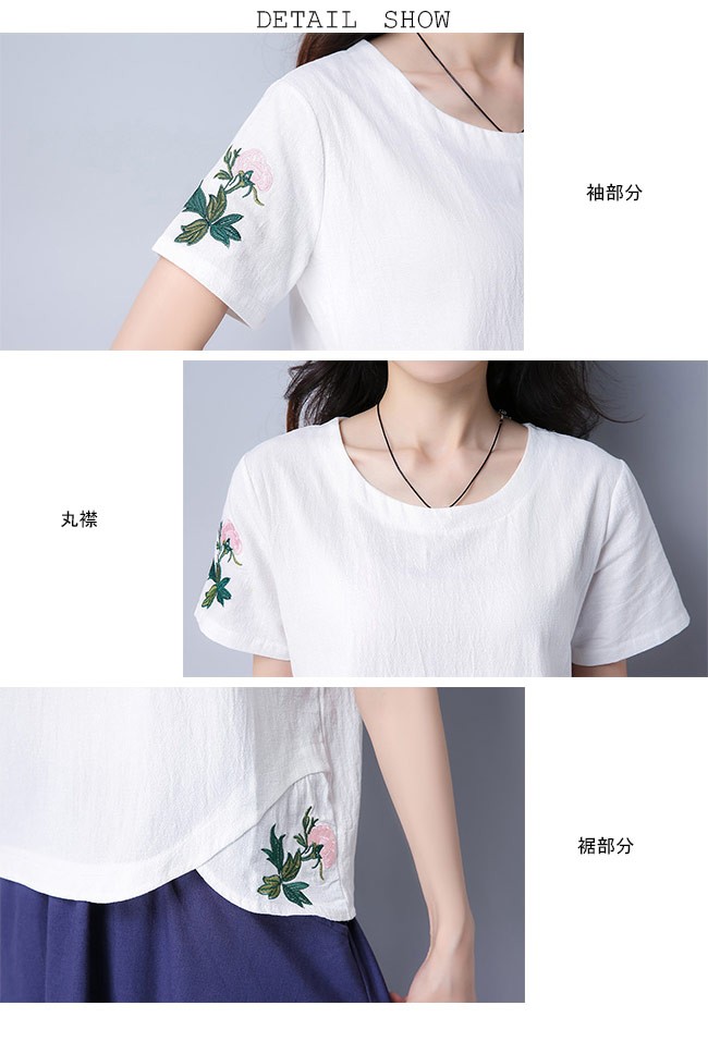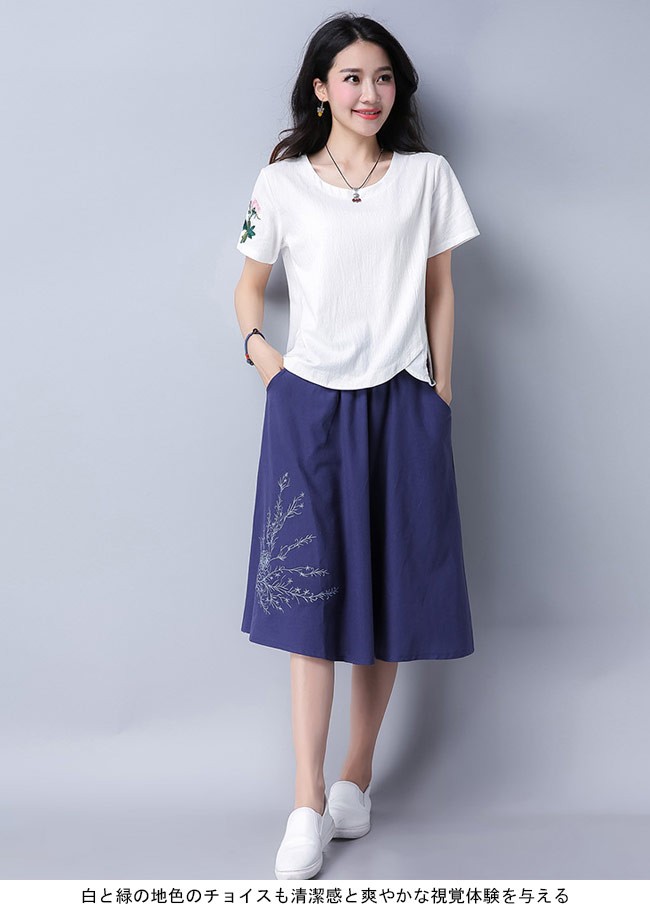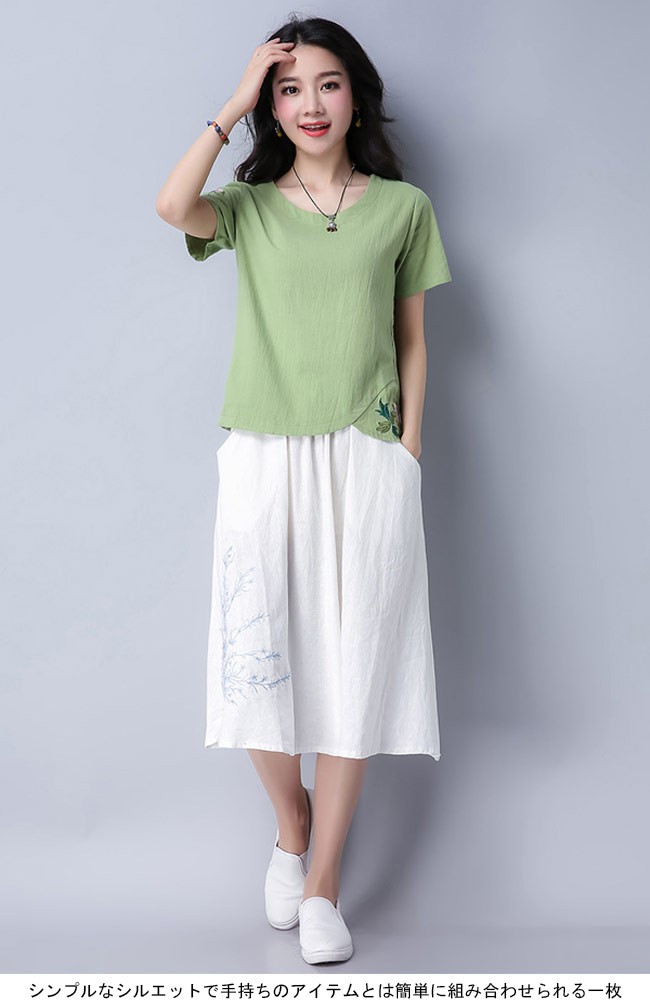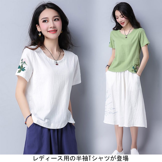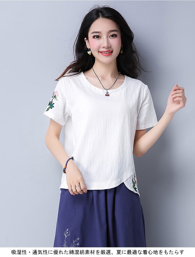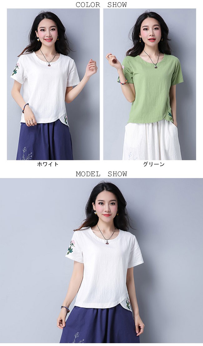 レディース 半袖Tシャツ 刺繍 丸襟 女性用 レトロ Tシャツ 夏物 トップス 半袖 薄手 カットソー エスニック風 着まわしレディース用の半袖Tシャツが登場吸湿性・通気性に優れた綿混紡素材を厳選、夏に最適な着心地をもたらす白と緑の地色のチョイスも清潔感と爽やかな視覚体験を与える花柄刺繍と裾部分のカッティングはレトロ感たっぷりのアクセントを付けるシンプルなシルエットで手持ちのアイテムとは簡単に組み合わせられる一枚カラー:ホワイト グリーン素材 綿混紡サイズ(cm) M L XL 2XLM 着丈55 バスト92 肩幅38L 着丈56 バスト96 肩幅39XL 着丈57 バスト100 肩幅402XL 着丈58 バスト104 肩幅41ご注意:※サイズは平置きサイズです。素人採寸ですので、若干の誤差がございます、ご了承ください。