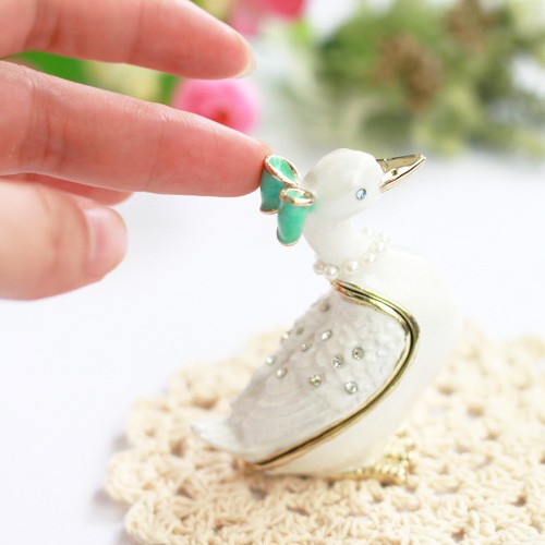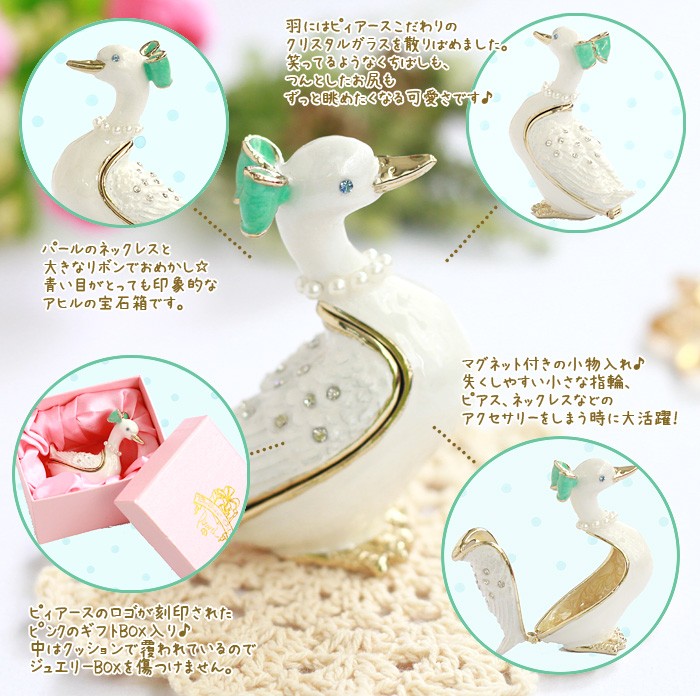 | ジュエリーボックスと言えば、指輪やピアス、ネックレスなどのアクセサリーを入れる引き出し型のケースを思い浮かべる方が多いかもしれません。 ピィアースのジュエリーボックスは、動物や花などをモチーフに作られ、合金製でずっしりとした重さがあります。また高品質のクリスタルガラスを贅沢に使用。まるでジュエリーボックスそのものが宝石のような、高級感溢れる仕上がりです。 小物入れとしても使えるように開閉口には磁石が取り付けてあり、アクセサリーなどなくしやすいアイテムの収納ができます。キラキラと美しく輝く宝石箱は、そのまま飾って楽しめるインテリア雑貨として多くの方に愛されています。 国内トップクラスのジュエリーボックスメーカーであるピィアースは、2004年ごろから本格的に宝石箱の製造を始め、現在のジュエリーボックスはなんと300種類以上。大規模展示会でもご好評いただいており、全国有名百貨店でも販売されています。 自社工場でひとつひとつ丁寧に手作りし、原型作成、研磨、加工、着色、小さなクリスタルガラスの取り付けなども全て手作業で行われるこだわりのハンドメイド品。完成後は厳しい検品の後、丁寧に梱包作業をしお客様にお届けしております。 ピィアース商品は、全国有名百貨店および全国有名宝石店チェーンにてお取り扱いいただいている高品質商品です。 ★自分へのご褒美に…コレクションして並べて飾ると、さらにかわいらしさUP! ★恋人へのプレゼント…中にアクセサリーを入れて、サプライズな贈り物として ★家族への感謝ギフト…お母さんや姉妹へ、日頃のありがとうの気持ちを込めて ★誕生日プレゼント…お友達の喜ぶ顔が見たいから、いつもと違うキラキラギフトを ★小さな女の子へ…まるでお姫様が使っているようなキラキラ宝石箱は女の子の憧れ! |