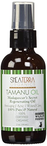 100% Pure, Virgin, Cold Pressed, Certified Organic Tamanu Oil is an ancient remedy for acne, burns, cuts and insect bites. Dr. Oz Show even had a segment on tamanu oil for the use of acne. Our pure, concentrated, uncut Tamanu Oil is the perfect solution for aging skin. It decreases wrinkles and boosts the retention of moisture. Shea Terra Organics Tamanu Oil is great for all skin types because it helps to even out skin tone. Although it works wonders on aging, dry and maturing skin, it also works wonderful on oily skin to normalize oil production. Use nightly under the eyes decreases wrinkles and darkness due to pooling. Shea Terra Organics brand of 100% Pure Tamanu Oil is valued for its purity and effectiveness. Freshly pressed in Madagascar, our Tamanu Oil is flown into the US to maintain freshness.Feature