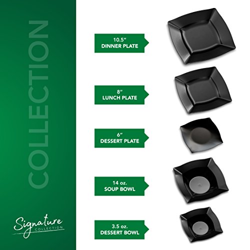 - ELEGANT AND CLASSY FROM SUPPER MEALS TO CATERED PARTIES: Square black bowl plates with flared metallic rims, pair perfectly with colorful table linens and other solid-color or patterned dinnerware. An all-time lunch plate for weddings, banquets, reunions, outdoor fun, your restaurant or catered event. These plates are a definite hit!!!!