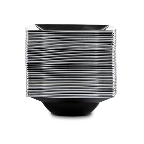 Signature Heavyweight - BLACK - Square Plastic 3.5-oz Small Bowl Plate with Silver Rim 40 Ct. Disposable / Reusable