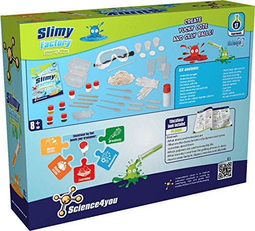 Slimy Factory Science Experiment Kit by Science4You engages children in creativity, new vocabulary, reasoning & concentration while having fun with a variety of yucky fascinating slime projects! STEM stands for Science, Technology, Engineering and Mathematics and is an education group used worldwide. This kit contains a 36 page educational book that guide kids through each of the 17 experiments. Discover how to create fun and gross dough, fantastic sticky monsters and more! This kit is recommended for ages 8 and up and requires adult supervision for safe play.Feature