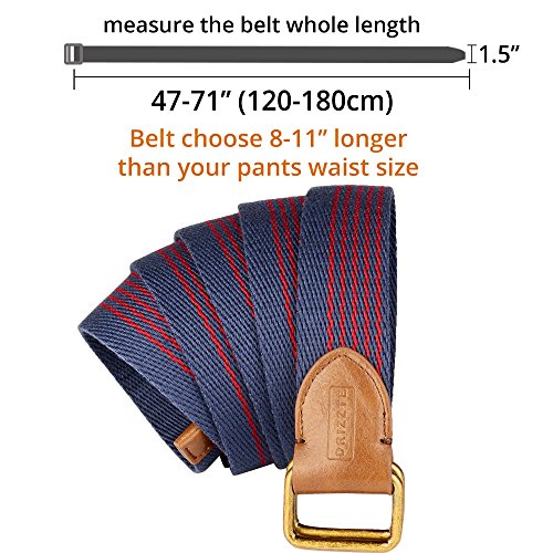 Binding : Apparel Product Description Drizzte Big-Tall 47-71' Double D Ring Mens Canvas Cloth Web Belt Navy Blue Gender: Men Womens Young Belts Material: Canvas Style: Casual Buckle 1.38x1.96' Belt Width 1.45' Belt Long 47' 51' 55' 59' 63' 67' 71' colors blue Belt size need choose longer than your waist size. 8-11' longer or shorter according to your preference. Size reference: [43': waist 32-35] [47': waist 36-39] [51': waist 40-43] [55': waist 44-47] [59': waist 48-51] [63': waist 52-55] [67': 56-59'] [71': 60-63'] Any query, just contact us, we promise do our best to solve your problem.