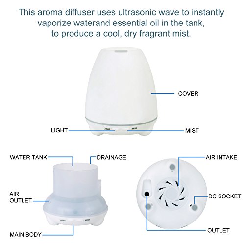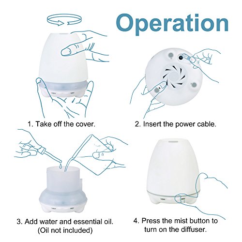 7 Color LED and 2 Mist Mode: 7 color changing lamp for your choice which is adjustable between bright and dim mode. Light can work alone when mist is off. Color including: dark blue, light bule, pink, green, red, yellow,white