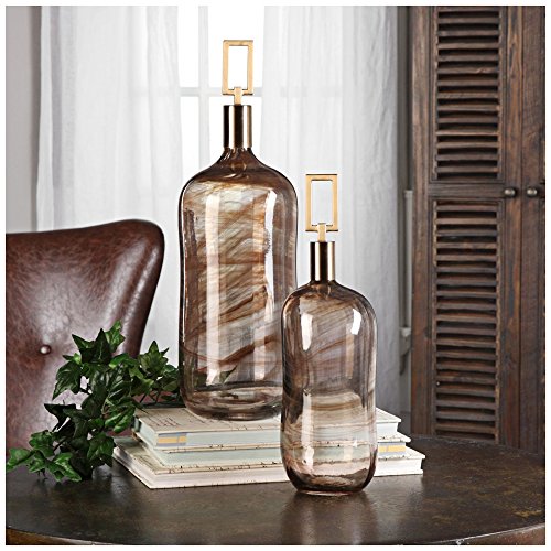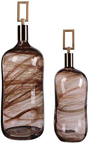 - Pearl glaze with warm brown swirls on the interior of the bottles the stationary metal finials are finished in a warm bronze due to the hand crafted nature of glass, finishes will vary slightly