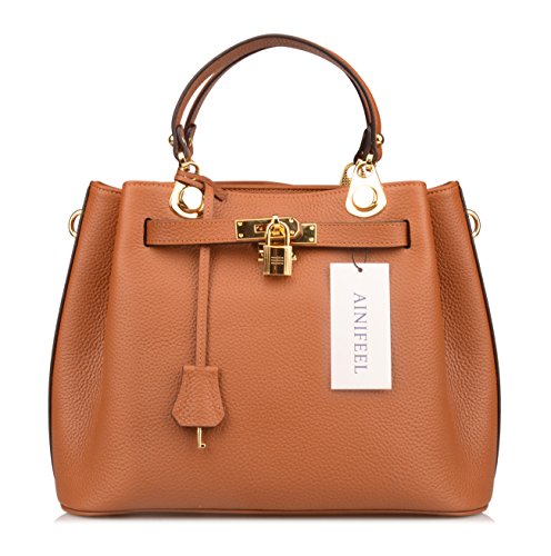 -. Brand : Ainifeel -. Color : Bean Green -. Department : womens -. Feature : Full grain cow leather. Synthetic lining. / Included lock and key(please take out all filling papers to find lock and key set at the bottom inside of the handbag) / Attached an adjustable and removable shoulder strap or crossbody strap / Three compartments. A zippered pocket and a cell phone pocket in one of compartments / 13'' (L) X 7'' (W) X 7.87'' (H), handle: 5'' -. PackageQuantity : 1 -. ProductGroup : Shoes -. ProductTypeName : HANDBAG -. Size : Medium -. Title : New Arrival Ainifeel Women's Buckle Padlock Genuine Leather Top Handle Purse Shoulder Handbag Crossbody