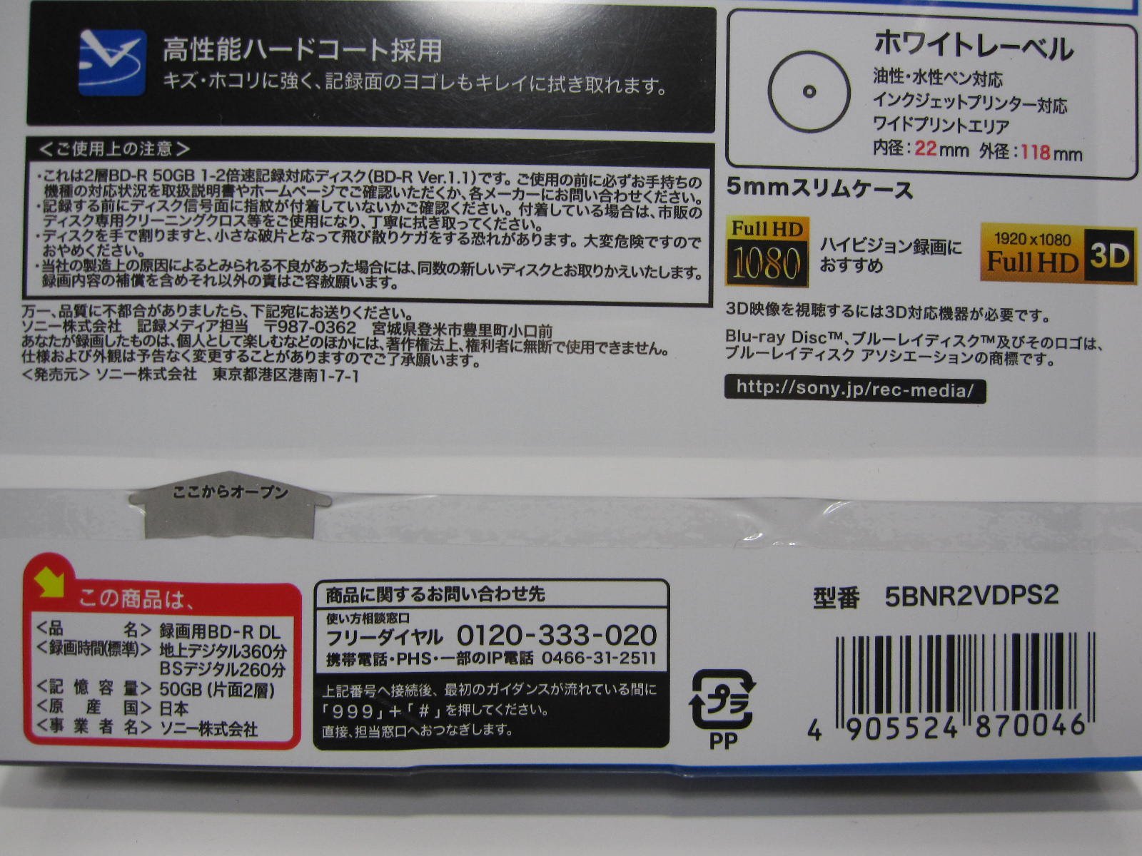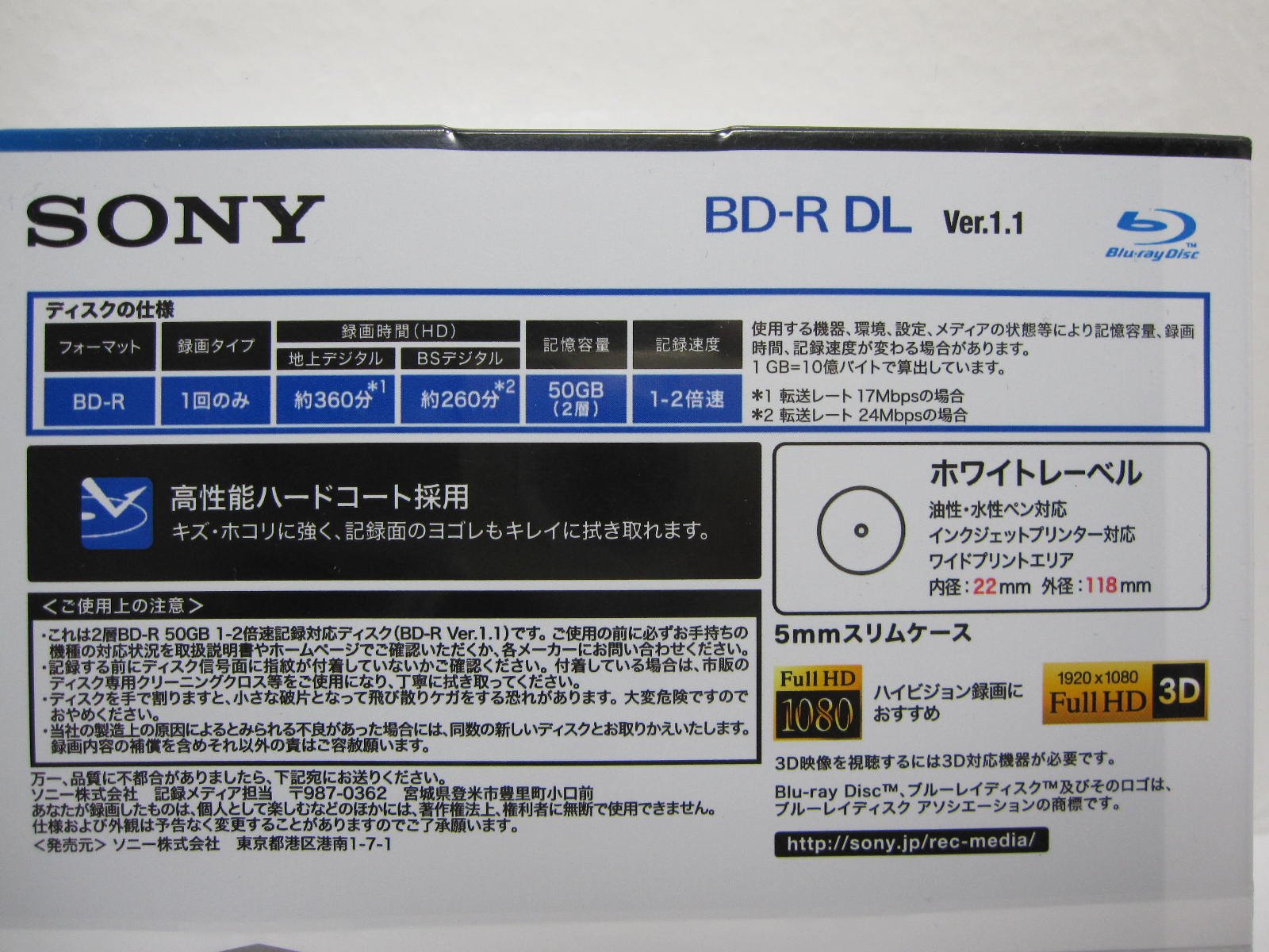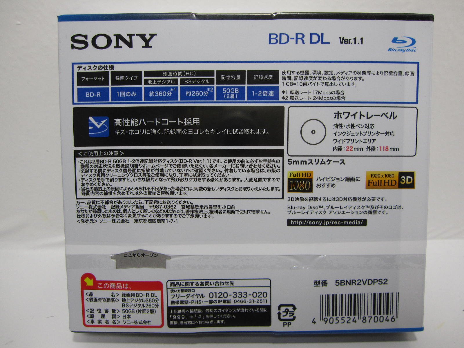 SONY 5BNR2VDPS2 | Sony recording for BD-R DL 5 sheets 2-speed printable 50GB 5mm case single-sided dual-layer Blu-ray