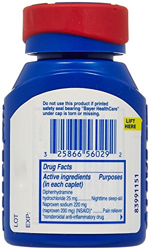 - Feature : Aleve pm easy open cap caplets are a pain reliver with a sleep aid / Contains naproxen sodium 220 mg / Dihenhydramine HCl 25 mg - pain reliever / nighttime sleep-aid / Soft grip cap / 80 caplets