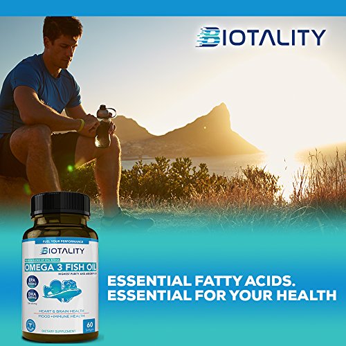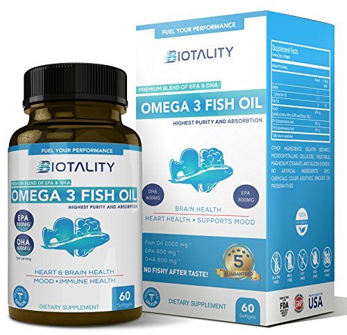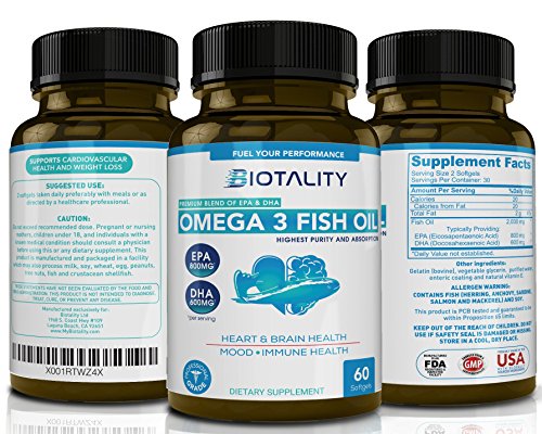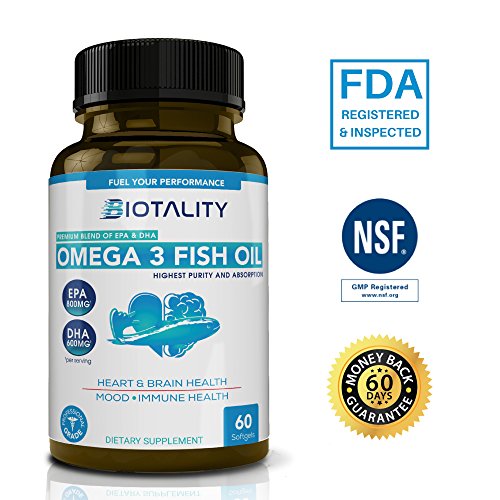 *BRAIN HEALTH * HEART HEALTH * SUPPORTS MOOD HIGHEST PURITY AND ABSORPTION EPA & DHA for brain support, heart health and weight management. Omega 3 Fish Oil may contribute to a more positive mood, reduce joint pain, contribute to healthier skin and nails as well as support your immune system. The positive health benefits of Omega 3 are due to the DHA and EPA within fish oil and our carefully formulated blend with maximum strength, means you benefit from the positive effects Omega 3 Fish Oil can have on your health now, and in the future. QUALITY MATTERS TO US Our FDA compliance efforts along with the independent NSF auditing program compliance ensure that we provide you with the very best quality supplements. Purchasing our Omega 3 Fish Oil is risk-free as we have a 100% 60 DAY MONEY-BACK GUARANTEE. We give you a full refund if you aren't satisfied with our products within 60 days.Feature