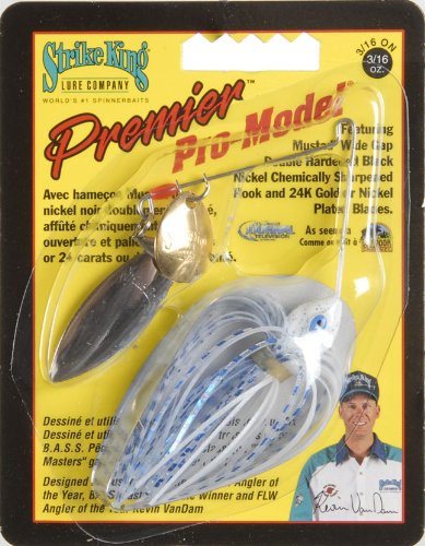 ReleaseDate : 2010-08-02 Studio : Strike King Lure Company Publisher : Strike King Lure Company Binding : Sports Product Description The Strike King Premier Pro-Model Spinnerbait features premium components. Includes 24K gold and/or nickel plated premium blades engraved with "Strike King". The blade size, perfect skirt, premier Vibra-Max wire provide maxium blade vibration. We use a superior quality Spin-Eze ball bearing swivel. The Mirage painted Diamond Dust head with Diamond eye, and Mustad double hardened premium black nickel chemically sharpened hook will draw and hook more fish. 0
