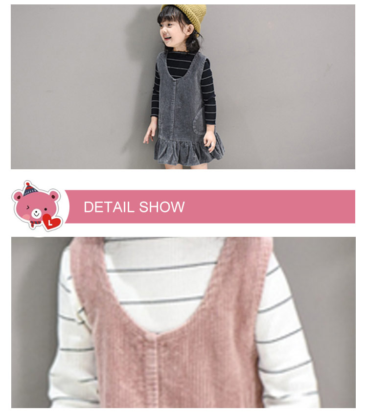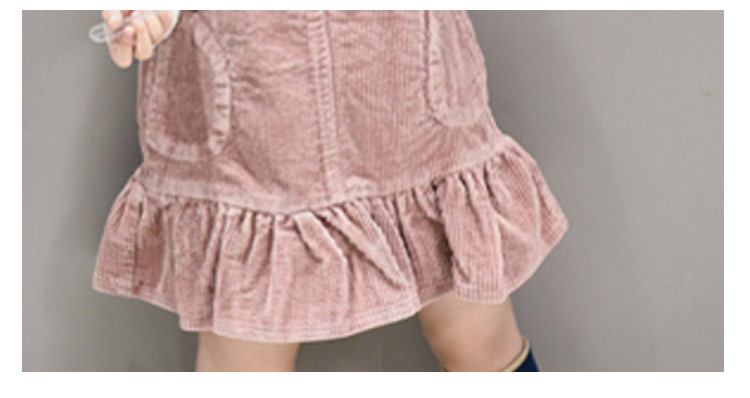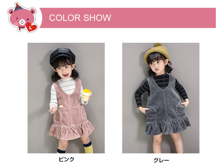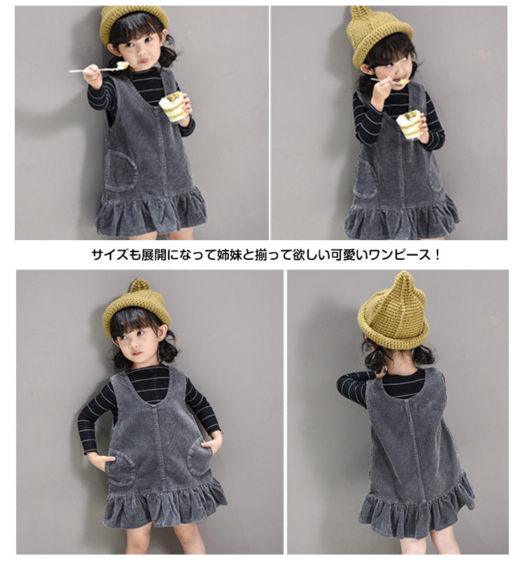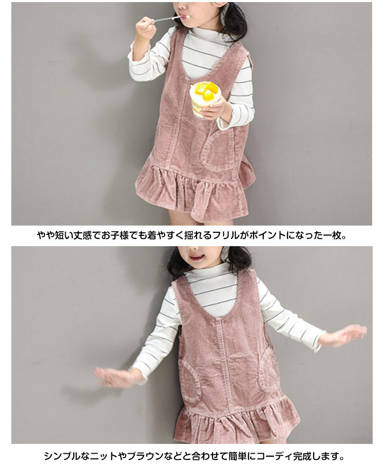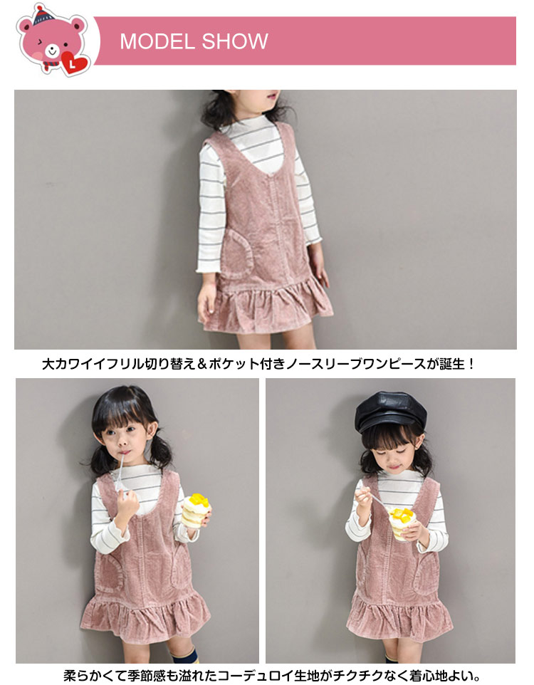 | ぬくもりのある素材で今季にぴったり!大カワイイフリル切り替え&ポケット付きノースリーブワンピースが誕生!柔らかくて季節感も溢れたコーデュロイ生地がチクチクなく着心地よい。やや短い丈感でお子様でも着やすく揺れるフリルがポイントになった一枚。シンプルなニットやブラウンなどと合わせて簡単にコーディ完成します。サイズも展開になって姉妹と揃って欲しい可愛いワンピース! | |
